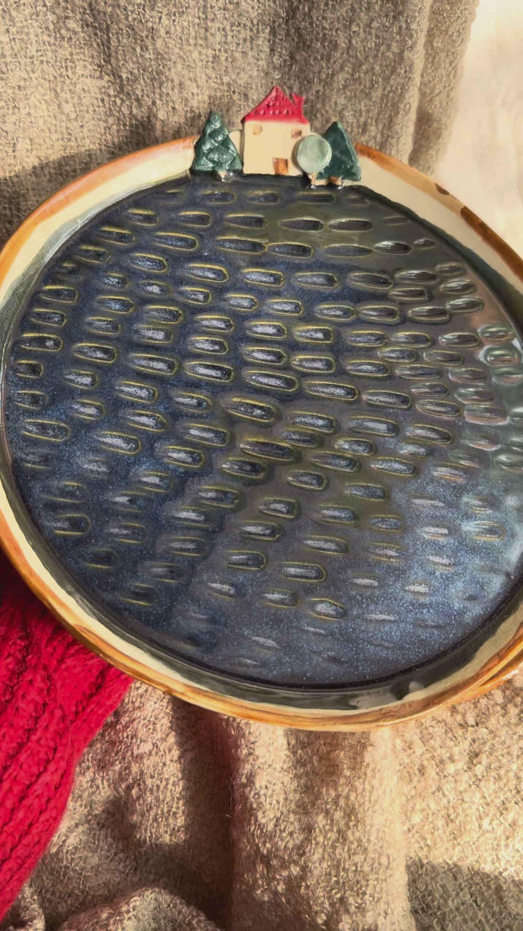 Bring a serene landscape to your table with this handcrafted plate. Its deep blue glaze mirrors the calm of a tranquil lake at dusk, while hand-carved details—a quaint house and gentle trees—emerge through the surface, creating the feeling of looking into a peaceful lakeside village.