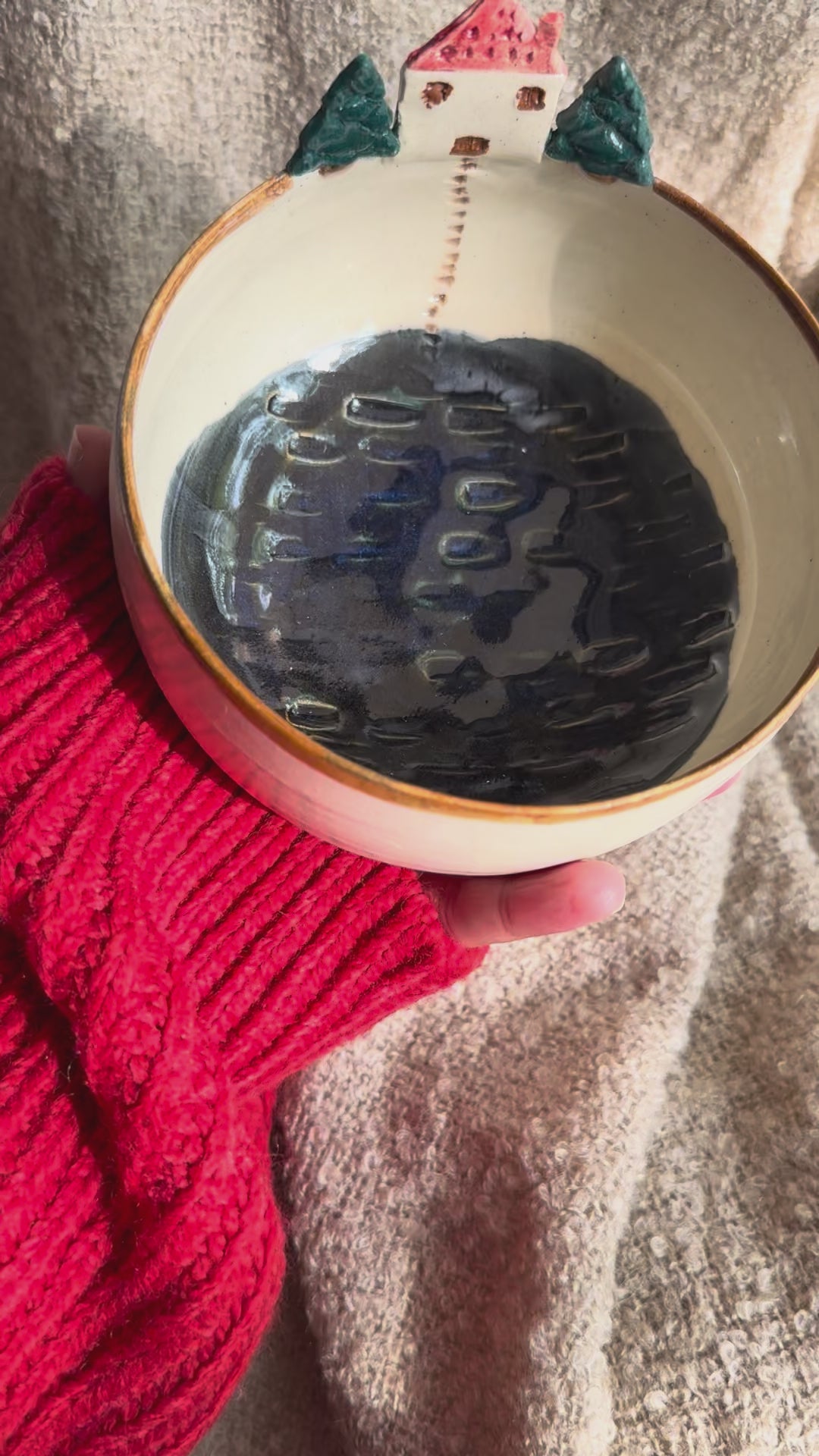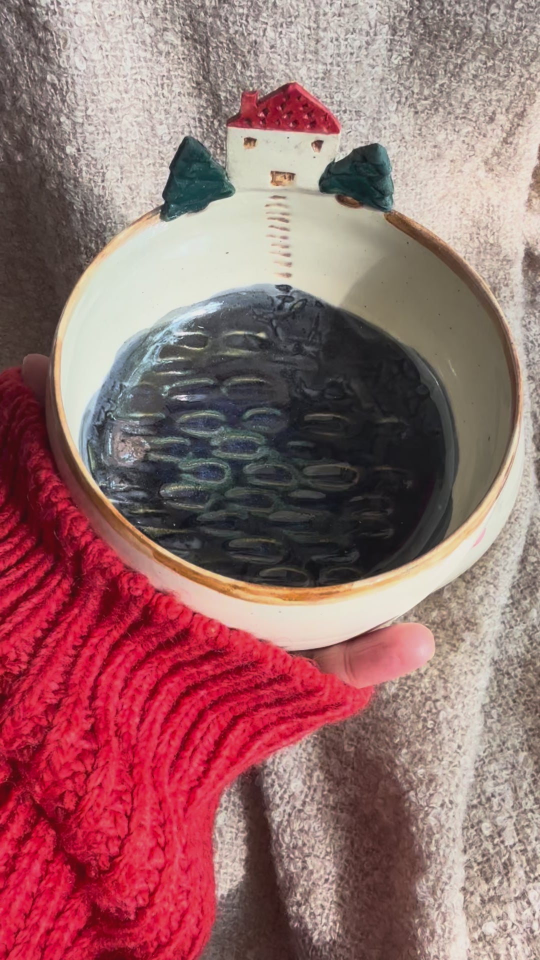 Discover a serene landscape captured in clay with this handcrafted bowl. Its deep blue glaze forms a tranquil lake-like view, where soft gradients of color evoke reflections of water at dusk. Subtle hand-carved details of a small house, winding stairs, and gentle trees creating the feeling of looking into a peaceful lakeside village.